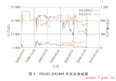 DX 183與DX1805井投產(chǎn)時間接近,但兩口井壓力下降的趨勢卻具有明顯的差別,不具有同步下降的特征(圖4);2009年9月,全氣田關井后,兩井壓力恢復值差別較大,應不屬于同一壓力系統(tǒng)。