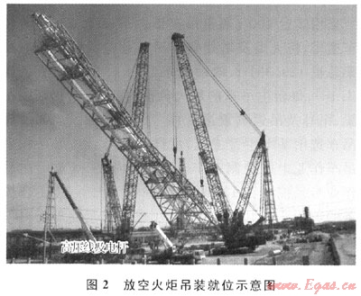 2009年6月16日和6月19日,采用整體滑移法分別完成了第1、2座放空火炬的吊裝,每座放空火炬的吊裝僅用了約50min,安全、順利、快捷,而且吊耳梁沒有任何變形。放空火炬吊裝就位示意圖如圖2所示。若采用分段吊裝、空中組對方案,不僅需要搭設(shè)高空組裝平臺,安全風(fēng)險大,進(jìn)度慢,而且要進(jìn)行2次400t履帶吊車塔式工況組裝和1次塔式工況拆除,至少需要11d時間,分段吊裝每座放空火炬又至少需要2d時間,此外,因占用400t吊車時間長,還會影響其他大型設(shè)備吊裝作業(yè),延緩工程施工工期。因此,采用分解吊點受力法整體吊裝放空火炬,不僅提前13d完成放空火炬吊裝任務(wù),節(jié)省400t履帶吊車租用費36萬元,加快了整個工程大型設(shè)備吊裝進(jìn)度,特別是在施工現(xiàn)場緊缺吊耳梁材料的情況下,采用分解吊點受力的方法,成功解決了吊耳梁強度不足的難題,實現(xiàn)了吊耳梁以小代大的嘗試,圓滿完成了大型放空火炬吊裝任務(wù),在吊裝技術(shù)上是一種創(chuàng)新。