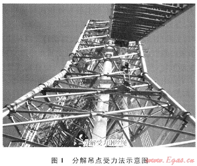 根據(jù)放空火炬塔架的結(jié)構(gòu)特點,整體吊裝放空火炬的吊點最適合設(shè)置在距塔架底部42m的塔架橫梁處,該處的塔架主肢為乃450mm×12mm鋼管,橫梁為Φ159mm×6mm無縫鋼管。為了在吊耳梁上安裝能滿足吊裝要求的吊耳,需將Φ159mm×6mm橫梁更換為DN400mm或DN350mm的厚壁鋼管,但現(xiàn)場只有Φ356mm×16mm(20號鋼)的無縫鋼管,且土庫曼斯坦資源匱乏,無法采購到合適的吊耳梁材料,從國內(nèi)采購、運輸?shù)闹芷谟趾荛L,無法滿足工期要求。經(jīng)計算,若采用Φ356mm×16mm的無縫鋼管制作吊耳梁,其與吊耳相貫處的彎曲應(yīng)力達(dá)到586MPa,是其許用應(yīng)力(137MPa)的4倍多,達(dá)不到吊裝要求。在此情況下,經(jīng)過技術(shù)論證和可行性研究,決定使用Φ356mm×16mm的無縫鋼管制作吊耳梁,并采用分解吊點受力的方法,以降低吊耳梁的彎矩和應(yīng)力。具體方法是用鋼絲繩把吊耳和吊點下部34m標(biāo)高的塔架主肢節(jié)點連接起來,并對鋼絲繩施加3t預(yù)拉力,將超過吊耳梁承受能力的吊裝負(fù)荷通過鋼絲繩傳遞到34m標(biāo)高的塔架主肢節(jié)點上,鋼絲繩的大小通過超載負(fù)荷計算得出。分解吊點受力法示意圖如圖1所示。