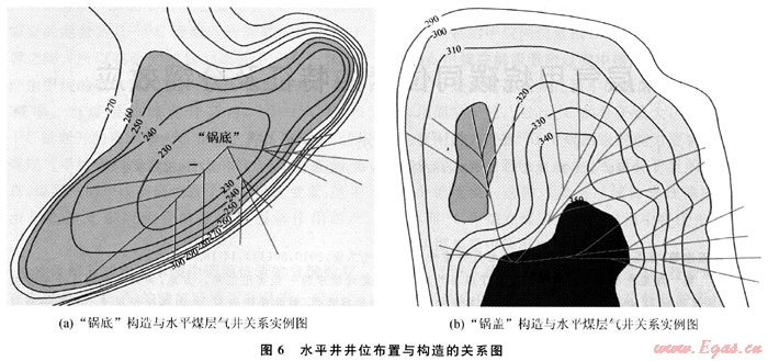 3) 對于“鍋底”構造發(fā)育部位的水平井部署,其井筒部位相當于煤層水的排泄區(qū),有利于煤層水的排采,盡管前期可能產氣效果欠佳,但排采到一定階段,這類水平井產氣效果較好;而對于“鍋蓋”構造發(fā)育部位的水平井部署,其井筒部位相當于煤層水的補給區(qū),不利于煤層水的排采,這類水平井,前期可能開始產氣時間較短,但衰減也快,不能很好地達到儲層降壓的目的,對后期排采不利。