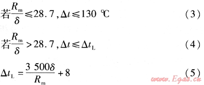 在計算極限狀態(tài)溫差時,若管道最大循環(huán)溫差不超過極限狀態(tài)溫差,錨固段的直管段不會發(fā)生局部屈曲。管道的極限狀態(tài)溫差和臨界徑厚比Rm/δ有關(guān),當(dāng)管徑確定,鋼管的壁厚越薄,越容易發(fā)生局部屈曲。最大循環(huán)溫差的極限狀態(tài)為: