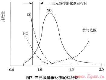 N0x減排催化劑可保證汽油發(fā)動機能按化學(xué)計量比運行。用一個O2敏感元件放置在催化劑的下游方(離開發(fā)動機),敏感元件向電控組件提供信號,調(diào)節(jié)進入汽缸的燃料量。