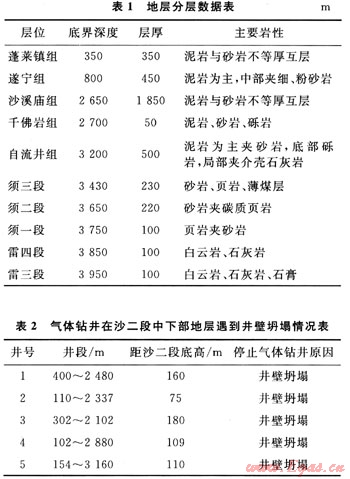 九龍山構(gòu)造區(qū)域?qū)儆诖ū臂晗輲е袎巍⒕琵埳奖睎|向構(gòu)造群,米倉山山前帶南部。西北緊鄰龍門山推覆構(gòu)造帶,北部為米倉山臺緣隆起,東南與川中隆起帶相鄰。地層分層數(shù)據(jù)見表1。地層分層的數(shù)據(jù)表明,在于佛巖組與自流井組存在堅硬的礫巖層,其礫巖成分有石英、燧石和黃鐵礦等,研磨性強,可鉆性極差,將導(dǎo)致機械鉆速急劇降低,以龍17井為例,在千佛巖組2932~3036m井段,進尺共104m,消耗鉆頭11只,平均單只鉆頭進尺僅為9.5m,平均機械鉆速為0.85m/h。多個區(qū)塊的鉆井實踐表明[3~6],與其他鉆井技術(shù)相比,氣體鉆井的提速效果異常明顯。因此,九龍山構(gòu)造開發(fā)前期,在沙溪廟組廣泛開展氣體鉆井技術(shù),但是氣體鉆井雖然機械鉆速加快,但多口井卻出現(xiàn)井壁坍塌,使井況更加復(fù)雜(表2),且由氣體鉆井轉(zhuǎn)換為常規(guī)鉆井后,下部地層的機械鉆速降低明顯。若要在下部地層繼續(xù)安全快速鉆進,液體欠平衡鉆井可作為一種重要手段。
