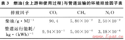 運(yùn)輸階段的污染物排放主要來自于燃料燃燒(汽油和柴油)的排放。不同的運(yùn)輸方式,其燃料種類、能源強(qiáng)度及燃料燃燒排放系數(shù)均不同。其中,汽車、油輪、貨船和火車的單位載重單位里程燃料消耗量分別為0.10267、0.10062、0.10030、0.10072kg/(t·km),燃油的生命周期溫室氣體排放[5~6]見表3。