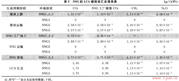 根據(jù)中國資源與市場分布的實(shí)際情況,這里考慮3種方案:①SNG工廠建址于煤礦坑口附近,通過1000km的長輸管道運(yùn)輸至目標(biāo)市場(SNG1);②SNG工廠建目標(biāo)市場附近,通過1000km火車貨運(yùn)煤炭至SNG工廠(SNG2);③基本情況同②,但采用船運(yùn)(SNG3)。SNG工廠的加工轉(zhuǎn)換效率取52.6%,SNG發(fā)電效率取52%。SNG項(xiàng)目作為煤化工的一種,在C02捕集方面具有天生的優(yōu)勢,如果按照可實(shí)現(xiàn)的捕集效率95%計(jì)算,則對SNG生命周期內(nèi)的碳排放帶來重大影響。SNG的LCA碳排放清單匯總結(jié)果見表5。