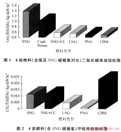 3) 在天然氣聯(lián)合循環(huán)發(fā)電為能源終端的情況下,SNG、SNG+CC(SNG工廠階段進(jìn)行碳捕集)、LNG、PNG及CBM全生命周期的C02的排放比例為2.90:1.20:1.12:1:1;CH4的排放比例為0.48:0.48:0.20:0.32:1。由于無法取得LNG部分階段的N2O指標(biāo),但相關(guān)資料顯示LNG與常規(guī)天然氣全生命周期的N20排放指標(biāo)基本相同。因此,對應(yīng)于上述5類能源形式的N2O排放比例為1.11:1.11:0.97:O.97:1。
