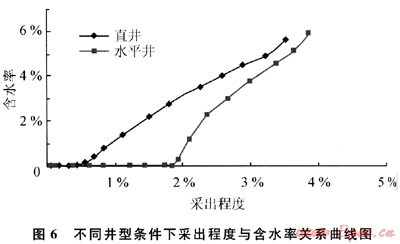 對(duì)于同一個(gè)邊底水油藏,采用不同的井型邊底水推進(jìn)的速度是不一樣的。對(duì)于強(qiáng)底水情況,模擬了圓形地層中心1口直井或1口水平井的開采情況,其采出程度與含水率關(guān)系曲線見圖6。從圖中可以看出,水平井的無水開采期比直井的無水開采期長得多,水平井的采出程度也比直井高。因此同等情況下,水平井的開發(fā)效果要好于直井的開發(fā)效果。