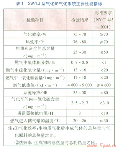 該氣化爐氣化系統(tǒng)穩(wěn)定運行后,依據(jù)NY/T443-2001《秸稈氣化供氣系統(tǒng)技術(shù)條件及驗收規(guī)范》對該系統(tǒng)進行檢測,主要技術(shù)性能指標(biāo)見表1。