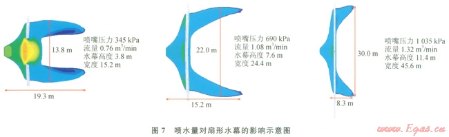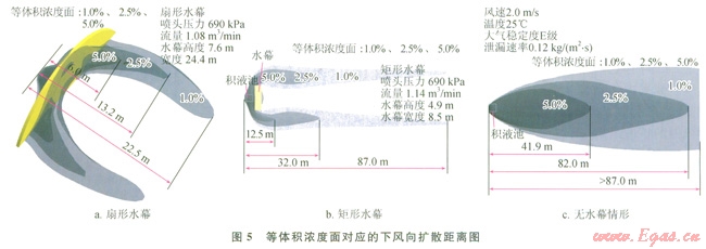 下面對扇形水幕的參數(shù)進(jìn)行研究,包括噴水量和水幕和擴(kuò)散源之間的間隔,這二者是影響水幕阻擋效果的主要因素。圖7顯示了不同水流量下,水幕對氣體擴(kuò)散的影響,在相同的大氣條件下,水流量越大,形成的水幕尺寸也就越大。當(dāng)扇形水幕流量為l.32m3/min,壓力1035kPa時,水幕高度為11.4m,寬度45.6m,LNG蒸發(fā)氣體下風(fēng)向擴(kuò)散的安全距離為8.3m。