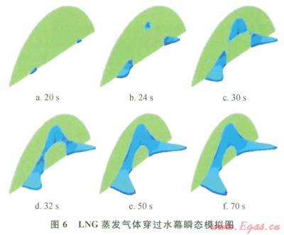 以穩(wěn)態(tài)速度場為初始條件,打開泄漏源,開始做瞬態(tài)計算,擴(kuò)散云團(tuán)與時間的依賴關(guān)系見圖6。圖6中所示為體積濃度2.5%的等濃度面,t=0時,擴(kuò)散開始,并保持LNG液體在積液池內(nèi)蒸發(fā)速率恒定[0.12kg/(m2·s)]??梢杂^察到,大約t=20s時,擴(kuò)散氣體已經(jīng)到達(dá)水幕位置,并開始穿越水幕,由于LNG擴(kuò)散氣體的重氣效應(yīng),側(cè)風(fēng)向尺寸較大,而豎直高度較小,同時,水幕的阻力系數(shù)沿徑向變化,距離中心點越遠(yuǎn),阻力系數(shù)越小,所以擴(kuò)散氣體在穿透水幕時,先從水幕的邊緣處開始,然后從頂部開始,逐漸向水幕的噴射中心點處靠攏,隨著時間的延長(大約t=50s時),水幕場景下的擴(kuò)散到達(dá)穩(wěn)態(tài),并保持云團(tuán)尺寸不變(該處云團(tuán)尺寸指體積濃度為2.5%的等濃度面),下風(fēng)向擴(kuò)散距離l3.2m,側(cè)風(fēng)向擴(kuò)散距離20.0m。