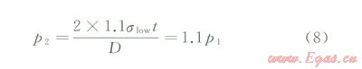 同樣,根據(jù)99%的可靠度,當(dāng)試壓的等效應(yīng)力達(dá)到slow時(shí),實(shí)際鋼管可承受的環(huán)向應(yīng)力為1.125slow,小數(shù)圓整后為1.1slow,由此對(duì)應(yīng)的強(qiáng)度試壓壓力P2計(jì)算公式為: