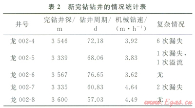 2010年下半年新鉆的以珍珠沖組和須家河組為目的層的中深井,包括龍002-4、龍002-5、龍002-6、龍002-7、龍002-8井等井,實(shí)鉆基本采納了建議的鉆井井身結(jié)構(gòu)和鉆井液密度安全窗口,中間技術(shù)套管下至坍塌壓力逐步抬升之前的沙溪廟組中下部,下部作為單獨(dú)一開(kāi)井眼;另外除龍002-6井外,各井鉆井方向選擇有利本區(qū)井壁穩(wěn)定性的方向(即75°~l65°或255°~345°);結(jié)合利用新技術(shù)(空氣鉆井、欠平衡鉆井、優(yōu)選鉆頭)鉆井效率得到明顯提高,基本沒(méi)有出現(xiàn)阻卡現(xiàn)象,僅偶爾出現(xiàn)幾次漏失或溢流情況,鉆井事故、復(fù)雜大大降低,如表2所示。其中龍002-4井刷新九龍山第四次開(kāi)鉆的疹152.4mm井眼定向井最短鉆井周期(原紀(jì)錄為l02d)和最高機(jī)械鉆速(原紀(jì)錄為2.79m/h)兩項(xiàng)紀(jì)錄;龍002-8井完鉆周期只有57.03d,刷新了九龍山四開(kāi)以須二段為目的層的直井最短周期記錄。地應(yīng)力分析技術(shù)(GMI)在九龍山新鉆井中取得很好的應(yīng)用效果。
