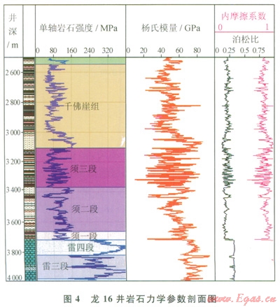 GMI地應(yīng)力模型提供了三軸主地應(yīng)力(上覆地層壓力、最小水平主應(yīng)力、最大水平主應(yīng)力)的大小和方向、地層孔隙壓力、巖石機(jī)械力學(xué)性質(zhì)(單軸巖石強(qiáng)度、楊氏模量、內(nèi)摩擦系數(shù)、泊松比)等4項(xiàng)參數(shù)的計(jì)算和描述。特殊地區(qū)還需考慮薄弱地層(特殊地層如鹽層)、原生斷層、裂縫的分布、地?zé)嵋蛩赜绊懙?。我們根?jù)九龍山構(gòu)造的鉆井、地質(zhì)、測(cè)井(包括成像測(cè)井)、測(cè)試等資料,以龍l6井為例建立了九龍山構(gòu)造的地應(yīng)力模型,基本摸清了本區(qū)的現(xiàn)今地應(yīng)力狀態(tài)。