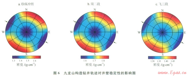 6)鉆井軌跡對(duì)井壁穩(wěn)定性的影響[9-10]:九龍山構(gòu)造不同方向的鉆井軌跡的井壁的穩(wěn)定性差異較大,如圖6所示:一般直井和定向井(井斜角少于45°)的坍塌壓力相對(duì)較低,井壁穩(wěn)定性相對(duì)較好;而水平井和大斜度井,平行最大水平主應(yīng)力方向,即為東東南(75°~165°)或西西北(255°~345°)方向的大斜度井(井斜大于45°),坍塌壓力相對(duì)較低,井壁穩(wěn)定性好,而垂直最大水平主應(yīng)力方向的水平井和大斜度井,坍塌壓力相對(duì)較高,鉆井風(fēng)險(xiǎn)較高。