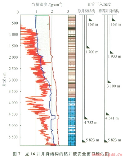 根據(jù)九龍山構(gòu)造地應(yīng)力模型和三個(gè)地層壓力剖面,對(duì)已鉆的龍16井和龍17井的井身結(jié)構(gòu)和鉆井液密度安全窗口進(jìn)行了風(fēng)險(xiǎn)評(píng)估(圖7)。從維持井壁穩(wěn)定性角度考慮,分析其井身結(jié)構(gòu)和鉆井液密度安全窗口存在較大的缺陷,致使中間技術(shù)套管段無(wú)可操作的鉆井液密度安全窗口,井壁穩(wěn)定性變差,這可能是兩井在該段頻繁出現(xiàn)遇阻、卡鉆甚至鉆井事故的力學(xué)根源;同時(shí)海相地層的鉆井液密度安全窗口也非常窄,極易誘發(fā)井漏、井涌溢流復(fù)雜。
