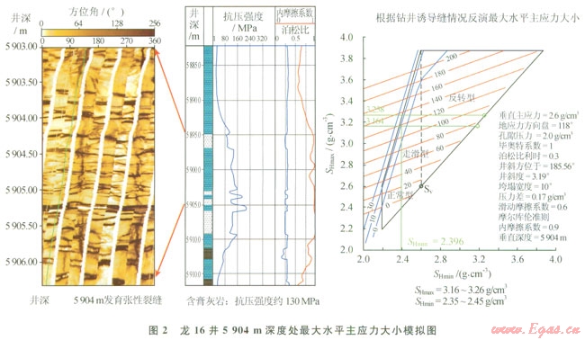 最大水平主應(yīng)力大小的定量確定比較困難,這是地應(yīng)力研究和應(yīng)用的一大難題。根據(jù)本區(qū)成像測(cè)井分析了各井在鉆井液液柱壓力下的井壁破壞類型及程度,利用地應(yīng)力分析模塊(GMI*SFIB),反演模擬小同深度處最大水平主應(yīng)力(SHmax)的大小。圖2顯示龍16井5904m深度處發(fā)育一條張裂縫,巖性為含膏灰?guī)r,巖石抗壓強(qiáng)度約l30MPa,上覆地層壓力當(dāng)量密度2.60g/cm3,最小水平主應(yīng)力當(dāng)量密度約2.30g/cm3,鉆井液密度(2.23~2.283/cm3)與孔隙壓力當(dāng)量密度之差為0.173/cm3,選取Mohr-Colum巖石破壞準(zhǔn)則,反演模擬其最大水平主應(yīng)力當(dāng)量密度為3.15~3.263/cm3。