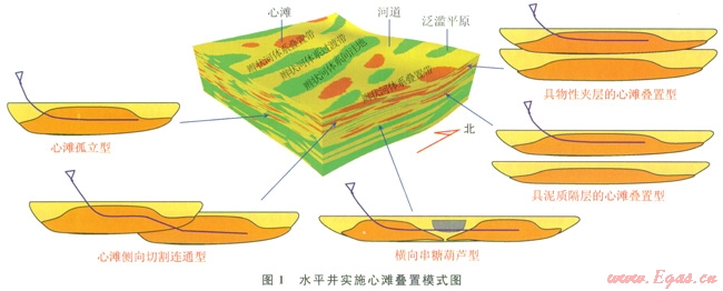 蘇里格氣田心灘砂體疊置模式復雜多樣,歸納起來,適合于水平井部署的有5種疊置模式(1):大型心灘孤立型、心灘側(cè)向切割連通型、橫向串糖葫蘆型、具物性夾層的心灘疊置型和具泥質(zhì)隔災層的心灘疊置型。