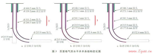 蘇里格氣田水平井鉆井經(jīng)歷斜導眼、直導眼和取消導眼3個階段,針對試驗期Æ311.15mm機械鉆速低、大井眼螺桿造斜率低、斜井段施工周期長、井壁穩(wěn)定性差等工程難點,通過理論研究和現(xiàn)場試驗,確定了蘇里格氣田水平井的主體井身結(jié)構(gòu)為Æ215.9mm斜井段+Æ152.4mm水平井段(3),既能大幅縮短鉆井周期,又能滿足目前主體改造技術(shù)要求[10]。在剖面優(yōu)化上,將剖面類型從中短半徑轉(zhuǎn)變?yōu)殚L半徑,靶前距從350m增加到450m左右,復合鉆井段70%以上,通過“上急下緩”雙增剖面,以84°左右井斜穩(wěn)斜探氣頂,使軌跡控制始終占據(jù)主動,確保準確入窗。同時,通過巖石可鉆性和鉆遇地層巖石礦物組分研究,在鉆頭結(jié)構(gòu)、水力參數(shù)、復合片性能等方面進行了個性化設(shè)計,改進流道設(shè)計和外部結(jié)構(gòu),優(yōu)選了適合于斜井段、水平段鉆井的PDC鉆頭,實現(xiàn)了PDC鉆頭全井段的應用,提高了機械轉(zhuǎn)速,縮短了鉆井周期。