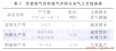加強(qiáng)排水采氣成熟技術(shù)的規(guī)?;瘧?yīng)用,形成了不同類型氣井排水采氣技術(shù)對(duì)策(表2);積極開(kāi)展數(shù)字化關(guān)鍵設(shè)備與控制軟件的研發(fā),低產(chǎn)低效井排水采氣技術(shù)應(yīng)用成效顯著。2012年開(kāi)展各類排水采氣2330口井/4.36萬(wàn)井次,累計(jì)增產(chǎn)氣量4.86×108m3。