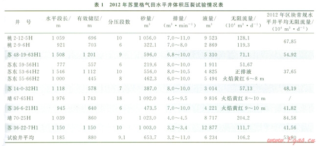 致密氣藏體積壓裂取得關(guān)鍵性突破。以“提高凈壓力,開(kāi)啟和支撐支裂縫”為關(guān)鍵點(diǎn),在脆性指數(shù)、微裂隙發(fā)育程度、二三向應(yīng)力場(chǎng)、抗張抗剪切強(qiáng)度研究基礎(chǔ)上,建立了致密氣藏體積壓裂的設(shè)計(jì)模式。自主研發(fā)了Æll4.3mm裸眼封隔器、懸掛封隔器、回接管等關(guān)鍵工具,設(shè)計(jì)了Æll4.3mm基管注入小級(jí)差滑套分壓管柱,可實(shí)現(xiàn)一次連續(xù)分壓23段,最大排量可達(dá)到12m3/min,適應(yīng)了體積壓裂“大排量、大液量、大砂量”的需要。2012年長(zhǎng)慶氣區(qū)實(shí)施體積壓裂改造11口井,平均試氣無(wú)阻流量超百萬(wàn)立方米,取得明顯效果(表1)。通過(guò)井下微地震監(jiān)測(cè),蘇東55-66H2井裂縫半長(zhǎng)235~560m,裂縫高度42~79m,裂縫帶寬100~220m。表明通過(guò)體積壓裂,橫向突破阻流帶,縱向突破隔夾層,形成了復(fù)雜縫網(wǎng),改造體積較常規(guī)壓裂增加2倍以上。
