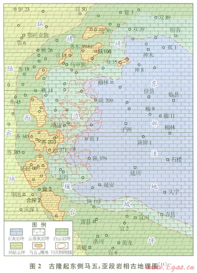 受沉積期古隆起控制,奧陶系下古生界中組合馬五5亞段沉積相呈環(huán)帶狀展布[9],局部發(fā)育的顆粒灘沉積經(jīng)白云巖化形成高滲儲(chǔ)層。在靖邊氣田西側(cè)由于馬五1一馬五4段區(qū)域剝蝕,馬五5亞段與上古生界煤系烴源巖直接接觸,有利于天然氣富集成藏[10]。