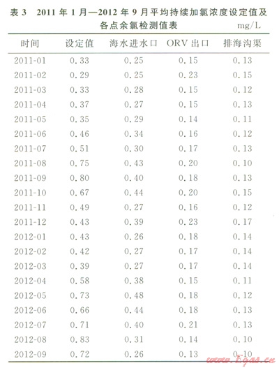 20091月至20129月,接收站加氯裝置一直連續(xù)運轉(zhuǎn),采用單臺設(shè)備運行的方式,加氯濃度的設(shè)定同時考慮ORV承受能力及外排海水余氯環(huán)保要求。期間平均持續(xù)加氯濃度設(shè)定值及各點余氯檢測值見表2、3