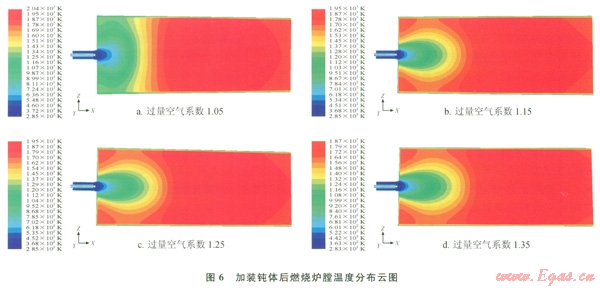 增加鈍體可以有效增加燃燒器出口的回流區(qū)域,使燃燒產(chǎn)生的高溫炯?xì)饣亓鳎黾尤紵姆€(wěn)定性,提高燃燒效率,同時(shí)還能有效提高爐膛溫度的均勻性。圖5為在燃燒器出口加裝鈍體后的中心軸線區(qū)域溫度分布情況,圖6為燃燒爐膛溫度分布云圖。