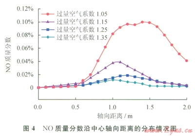 圖4為N0質(zhì)量分?jǐn)?shù)沿中心軸向距離的分布情況,由圖4可知,a為1.05時(shí),NO的峰值最大,其質(zhì)量分?jǐn)?shù)達(dá)到0.11%,結(jié)合圖2的溫度分布可知,當(dāng)a為1.05時(shí),具有最高的溫度峰值,較高的溫度會(huì)促使熱力型NO的生成量增加;a為1.15時(shí),NO的峰值為0.018%;a為1.25時(shí),NO的峰值為0.039%;a為1.35時(shí),NO的峰值為0.012%,可以看出NO的生成量與燃燒工況的溫度有較大的關(guān)系。NO的質(zhì)量分?jǐn)?shù)隨著軸向距離的增加呈現(xiàn)出先增后減的趨勢(shì),如a為1.05時(shí),在X為1.0~1.6m區(qū)間NO的質(zhì)量分?jǐn)?shù)最高,結(jié)合圖2可知該區(qū)間具有較高的溫度分布。4種過(guò)量空氣系數(shù)下?tīng)t膛出口處NO的質(zhì)量分?jǐn)?shù)分別為0.0427%,0.00218%,0.000996%,0.000254%,從減少污染物排放的角度考慮,工況4(a為1.35)是最優(yōu)的,產(chǎn)生的NO含量最低。