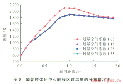 在過(guò)量空氣系數(shù)(d)分別為1.05、1.15、1.25和1.35這4種工況下,爐膛燃燒區(qū)域溫度沿中心軸向距離(X)為0~2.0m(取燃燒器擴(kuò)散噴口出Vl為X=0的位置)的分布如圖2所示。