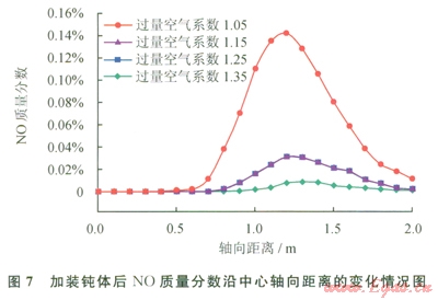 由圖5、6可知,加裝鈍體后,峰值溫度下降,平均溫度較沒(méi)加裝鈍體之前有所降低,X為0.8m后溫度相對(duì)均勻,燃燒穩(wěn)定,且有利于降低NO的生成量,可見(jiàn)加裝鈍體優(yōu)化后燃燒器的整體性能有所提高。同時(shí)從圖中還可以看出:a為1.05時(shí),中心軸向距離0.22m以后的溫度均高于a為1.15、1.25、1.35時(shí)的溫度。這主要是由于空氣與燃?xì)鈩倗姵鰰r(shí),a為1.15、1.25、1.35時(shí)的空氣量相對(duì)較足,反應(yīng)進(jìn)行迅速,溫度升高較快,致使3種工況在中心軸向距離0.22m以前具有較高的溫度,但由于頁(yè)巖氣中甲烷的濃度一定,燃燒放熱量一定,隨著過(guò)量空氣系數(shù)的增加,反應(yīng)溫度有所降低,在X為0.22m以后較為明顯。