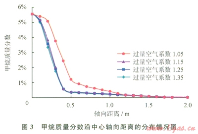 圖3反映了甲烷質(zhì)量分?jǐn)?shù)沿中心軸向距離的分布情況。在爐膛的尾部,甲烷的質(zhì)量分?jǐn)?shù)都幾乎為0,4種工況的甲烷轉(zhuǎn)化率都超過(guò)99.8%,其中,a為1.15、1.25、1.35這3種工況下的甲烷質(zhì)量分?jǐn)?shù)變化最快,到X為0.60m處就幾乎燃盡,容易在燃燒器根部形成高溫區(qū)域;a為1.05時(shí),甲烷質(zhì)量分?jǐn)?shù)下降相對(duì)緩慢,在0.60m處達(dá)到1.2%。