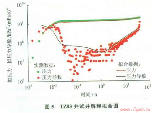 如TZ83井,5 666~5 684 m井段儲層的沉積環(huán)境主要為粒屑灘、灰泥亞相,沉積微相主要發(fā)育中等能量砂屑灘、丘核。巖性主要為隱藻泥晶灰?guī)r,其中泥質(zhì)條帶被黑色和綠色泥質(zhì)充填,孔隙度介于0~3.8%,儲層類型以Ⅲ類為主,夾Ⅳ類儲層。完井酸壓求產(chǎn)測試,7 mm油嘴產(chǎn)量基本穩(wěn)定,但是流壓降低4.0 MPa左右,說明單井控制范圍有限。試井曲線表現(xiàn)出外圍變差的復合模型特征(圖5)。