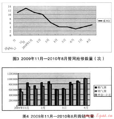 我公司2010年2月使用加濕技術時擁有干管鑄鐵閥門約61座,鑄鐵管網(wǎng)總長度84.8km,調壓站(箱)15個;日供氣能力約2.3萬m3。下面的一組圖表反映的是我公司2009-2010年加濕前后管網(wǎng)搶修及各月燃氣購、銷氣量及氣損統(tǒng)計情況: