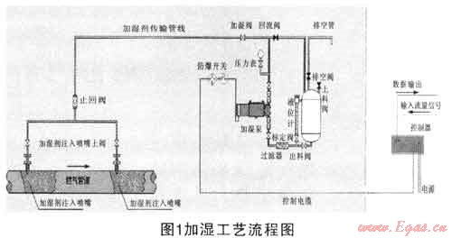宜春深燃天然氣有限公司自2010年2月開始使用溶劑油加濕劑對天然氣進行加濕,溶劑油加濕工藝設備主要由控制器、儲藥罐、加濕泵、各閥門組、壓力表及加濕噴嘴等組成,工藝如圖1所示: