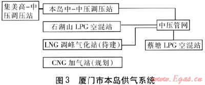 廈門市本島供氣系統(tǒng)見圖3。鑒于本島地理位置(四面環(huán)海,外圍既無高壓管道,也無地下儲氣庫)的特點,LNG氣化站是城市管網(wǎng)供氣高峰調(diào)峰和事故應(yīng)急的首選方式。