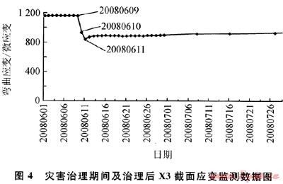 2008年4月29日該管段地區(qū)出現(xiàn)一次強降雨,4月30日管道應(yīng)變監(jiān)測數(shù)據(jù)即出現(xiàn)異常變化(圖2):X3截面的彎曲應(yīng)變躍升為856.7個微應(yīng)變,即短短5t時間,X3截面的彎曲應(yīng)變增加了477.7個微應(yīng)變。很明顯,管道在短期內(nèi)彎曲變形加大,已呈突變態(tài)勢。且便如此,GPS地表位移監(jiān)測仍未顯示出地表異常,地表位移變化仍在毫米級。