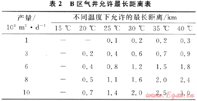 2) B區(qū)氣井的天然氣不伴熱直接進(jìn)站,需要加熱才能脫水,可以取消采氣管道伴熱。不同產(chǎn)氣量和井口溫度,允許采氣管道距離不同,其允許最長(zhǎng)距離見(jiàn)表2。