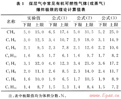利用上述方法對(duì)煤層氣中常見(jiàn)有機(jī)可燃性氣體(或蒸氣)的爆炸極限進(jìn)行了計(jì)算(見(jiàn)表1)。