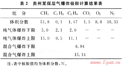 以貴州某煤層氣為例,利用以上方法計(jì)算了多組分煤層氣的爆炸上限和下限(見(jiàn)表2)。由表2可以看出,混合氣的爆炸極限與純氣體的爆炸極限有一定區(qū)別。
