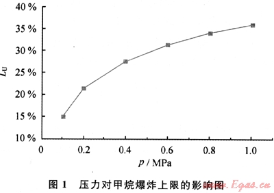 式中LU,p是壓力P時(shí)的爆炸上限;LU是常壓(p=0.1MPa)時(shí)的爆炸上限;p是燃?xì)饨^對(duì)壓力。