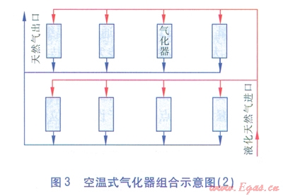 空溫式氣化器的臺(tái)數(shù)和氣化量,可跟據(jù)工程建設(shè)規(guī)模和用戶的要求綜合確定??諟厥綒饣鹘M合示意見圖23。