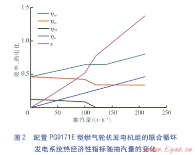 燃?xì)廨啓C(jī)發(fā)電機(jī)組在額定工況下運(yùn)行,改變汽輪機(jī)抽汽量,配置兩種燃?xì)廨啓C(jī)發(fā)電機(jī)組的聯(lián)合循環(huán)發(fā)電系統(tǒng)的熱經(jīng)濟(jì)性指標(biāo)分別見(jiàn)圖l、2。