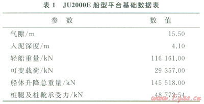以現(xiàn)今主流的400Ft自升式JU2000E船型為基礎(chǔ)建立等效有限元模型,選取我國(guó)東海黃巖海域?yàn)槟M環(huán)境海區(qū),平臺(tái)自身性能參數(shù)如表l所示,海區(qū)環(huán)境參數(shù)基本數(shù)據(jù)如表2所示。