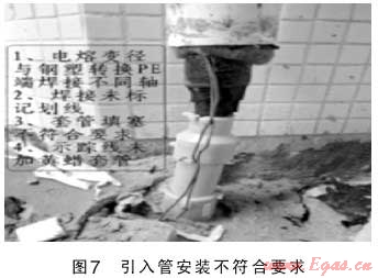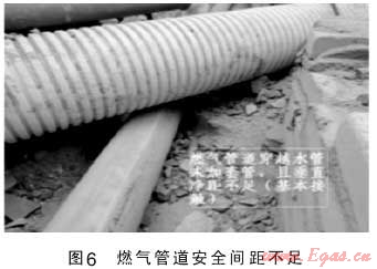 在燃氣管道施工過程中,因施工單位人員、現(xiàn)場監(jiān)理人員以及建設單位現(xiàn)場管理人員對燃氣管道安裝施工質(zhì)量監(jiān)管不到位,施工經(jīng)驗不足或者根本不懂燃氣管道施工的重要性,不按照燃氣行業(yè)國家規(guī)范和行業(yè)標準嚴格操作和監(jiān)管,產(chǎn)生一系列施工質(zhì)量隱患。如鋼管防腐處理不到位、閥井內(nèi)波紋補償器受外力安裝偏斜或不同軸,電熔管件焊接焊口冷卻采取沖水冷卻方式,PE管道運輸、搬運造成管壁劃傷嚴重超標等人為因素,給城市燃氣管道安全運行種下了一顆顆定時炸彈(如圖3、4、5)。