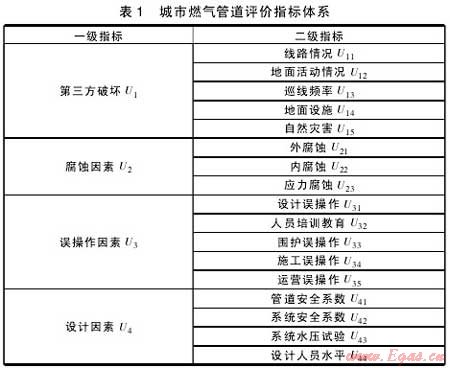 在城市燃?xì)夤艿里L(fēng)險(xiǎn)評(píng)價(jià)中,造成管道失效和事故的原因有第三方破壞、腐蝕、設(shè)計(jì)因素和人為操作因素等,其中腐蝕和第三方破壞是最主要的原因。因此造成燃?xì)夤艿朗У囊蛩丶?/span>U={u1,u2u3,u4}={第三方破壞,管道腐蝕,管道誤操作水平,管道設(shè)計(jì)水平}。這四個(gè)主要影響因素又分別可細(xì)劃分為若干子因素。