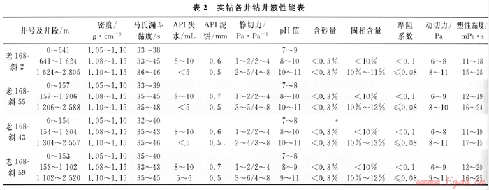 所采取的具體措施:①該叢式井組第一次開鉆采用老漿開鉆,小循環(huán)鉆進(jìn),向鉆井液中不斷補(bǔ)充天然高分子強(qiáng)抑制性包被絮凝劑(IND-30)及高分子包被絮凝劑(ZH-O2),利用高分子聚合物的絮凝作用及聚合物間的交聯(lián),協(xié)同能力提高鉆井液的抑制能力;②對于淺地層(平原組)大井眼定向的井(如老168-斜55、老168-斜43、老168-斜59井),當(dāng)井斜達(dá)到30°左右時及時混入原油,并根據(jù)進(jìn)尺情況加以補(bǔ)充,以提供足夠的潤滑性來降低摩阻及扭矩;③鉆進(jìn)過程中保持足夠的排量(≥55L/s),充分清洗井眼攜帶巖屑;④鉆完第一次開鉆井深,用前井回收的老漿并加入2%的白油封裸眼井段,確保表層套管的順利下入。