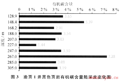 室內(nèi)實驗研究的結(jié)果表明,龍馬溪組黑色頁巖中所含的有機質(zhì)類型主要為腐泥型和偏腐殖混合型,有機質(zhì)成熟度(Ro)介于1.62%~2.26%之間,平均為2.04%,有利于天然氣的生成(現(xiàn)今主要為殘留熱解氣及生物再作用氣)。結(jié)合頁巖含氣量檢測結(jié)果,對渝頁1井部分巖心進行了有機碳含量測試。燃燒法測定結(jié)果表明,深度128.9~305m之間10個樣品的有機碳含量值變化于1.44%~7.28%,一般達到3.0%左右,平均為3.7%(圖3)。由于有機質(zhì)是天然氣生成與吸附的主體,故有機碳含量的大小幾乎決定了頁巖中的天然氣含量,即有機碳含量與頁巖氣含量呈正比。