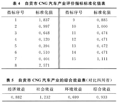 按上述評價模型,將2007年自貢市CNG汽車產(chǎn)業(yè)評價指標標準化,其結(jié)果如表4。綜合效益計算結(jié)果見表5。