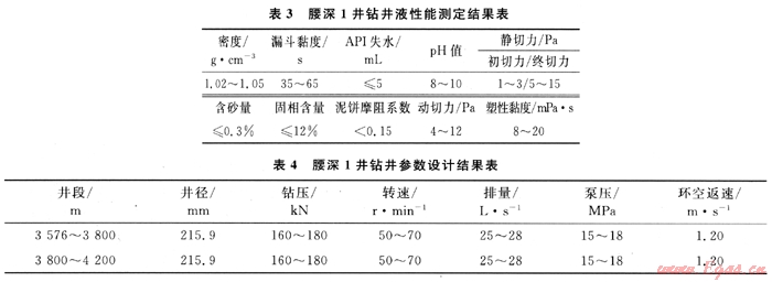 從腰深1井鄰井DB2井和DB11井情況來(lái)看:①DB2井在鉆進(jìn)至嫩江組、姚家組地層時(shí),出現(xiàn)垮塌掉塊現(xiàn)象;②DB11井鉆進(jìn)至4002.07m時(shí)出現(xiàn)井內(nèi)垮塌現(xiàn)象,經(jīng)調(diào)整鉆井液性能后返出大量巖屑,井下才恢復(fù)正常。從腰深1井地層巖性預(yù)測(cè)結(jié)果可知,欠平衡鉆井井段存在泥巖層,易吸水膨脹而產(chǎn)生剝落掉塊、垮塌。從鄰井分析和腰深1井巖性預(yù)測(cè)均表明,在欠平衡井段應(yīng)選用防塌性能好的鉆井液體系,為此決定采用聚合醇抑制型防塌鉆井液體系。
