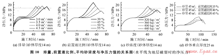 從圖10可以得出排量和平均砂濃度沒有前置液比例對縫內(nèi)凈壓力上漲的控制力度大,且25m垂直厚度的厚儲(chǔ)層凈壓力漲幅遠(yuǎn)低于14m的薄儲(chǔ)層凈壓力的漲幅。按照凈壓力預(yù)測結(jié)果,以增加主裂縫縫長和控制次生裂縫產(chǎn)生為出發(fā)點(diǎn),蘇5、桃7區(qū)塊水平井分段壓裂參數(shù)優(yōu)化范圍如下:排量3.5~4.0m3/min、薄砂體前置液比例45%~50%,厚砂體前置液比例43%~45%,平均砂濃度360~400kg/m3。